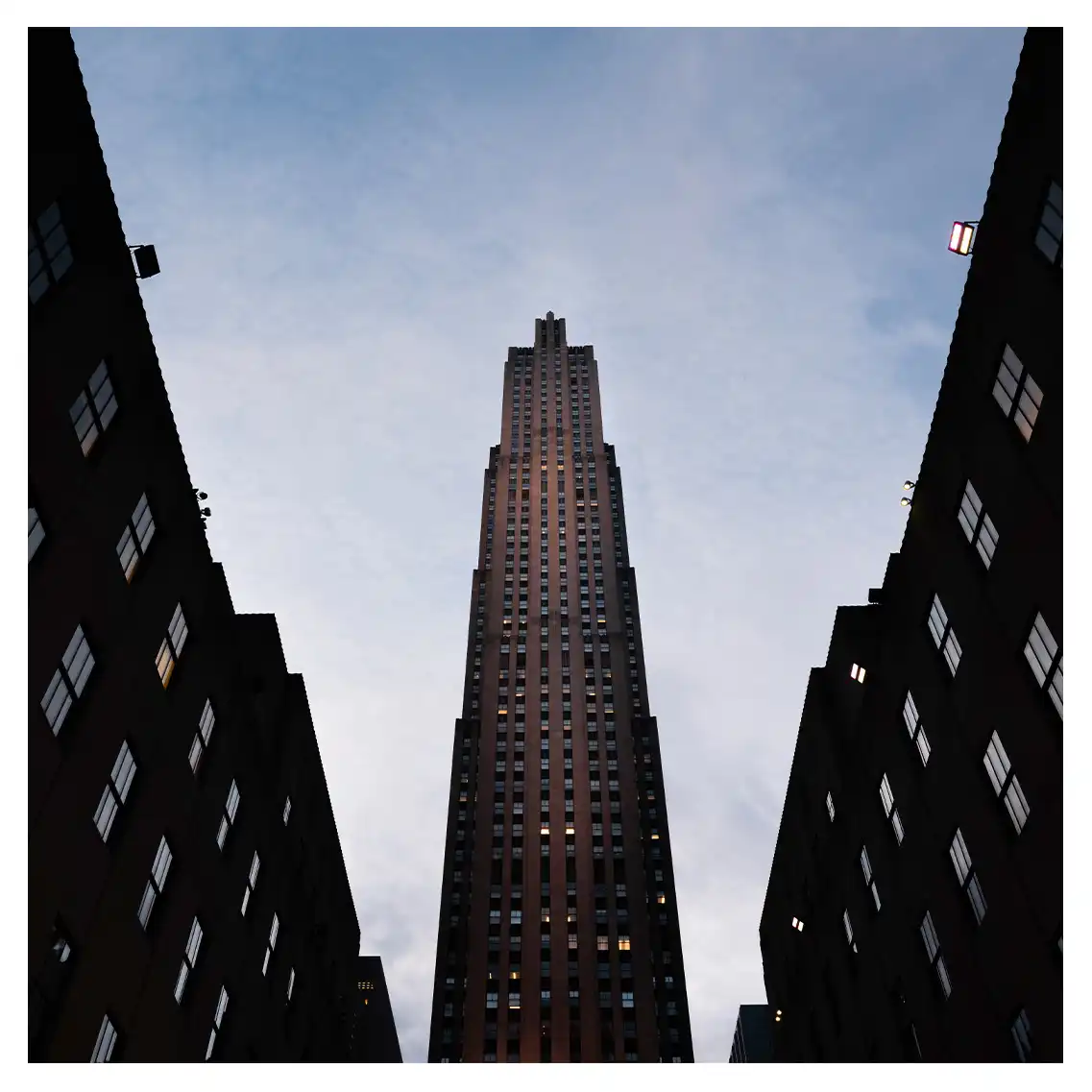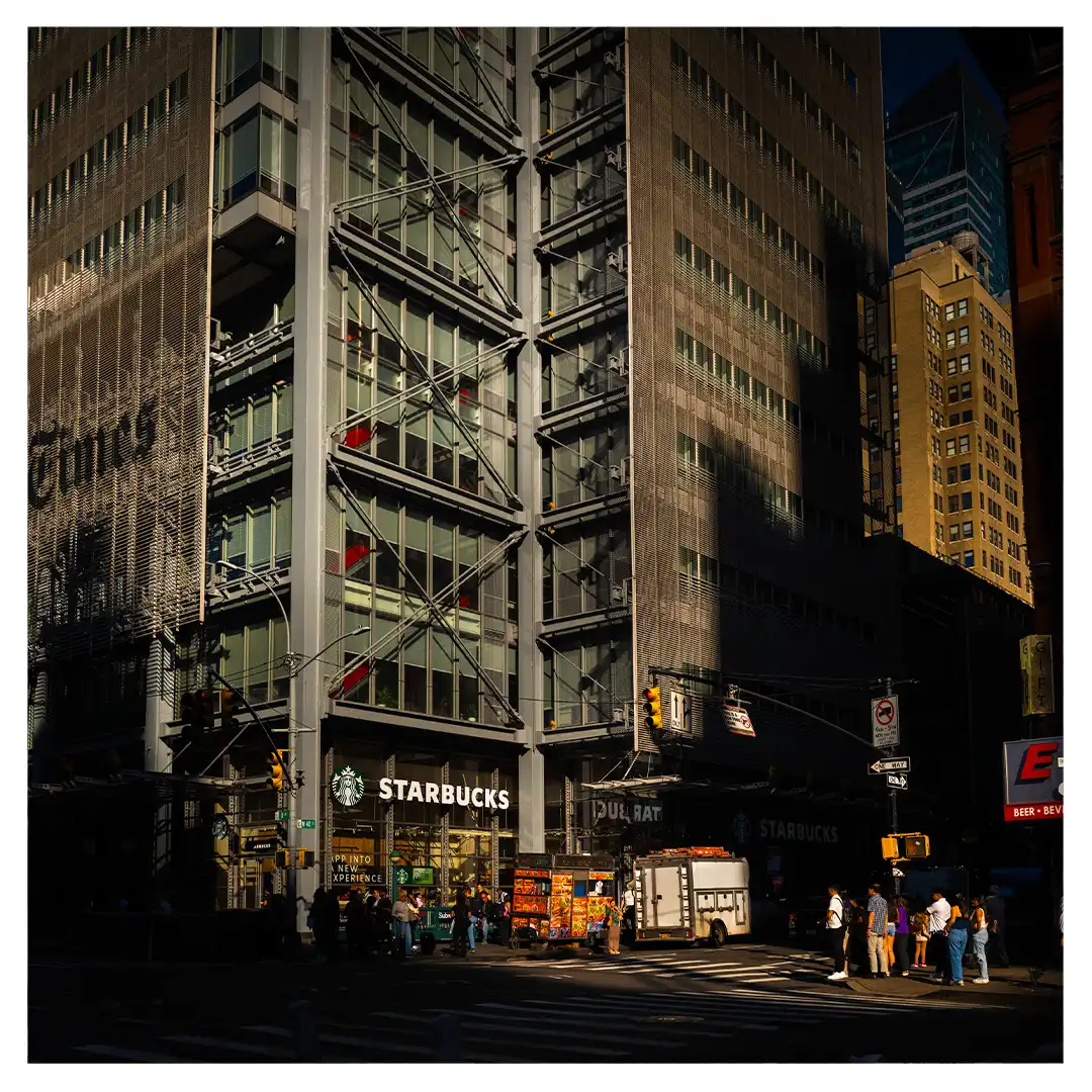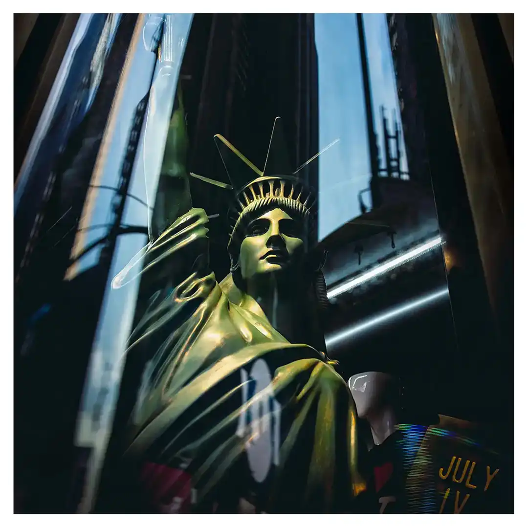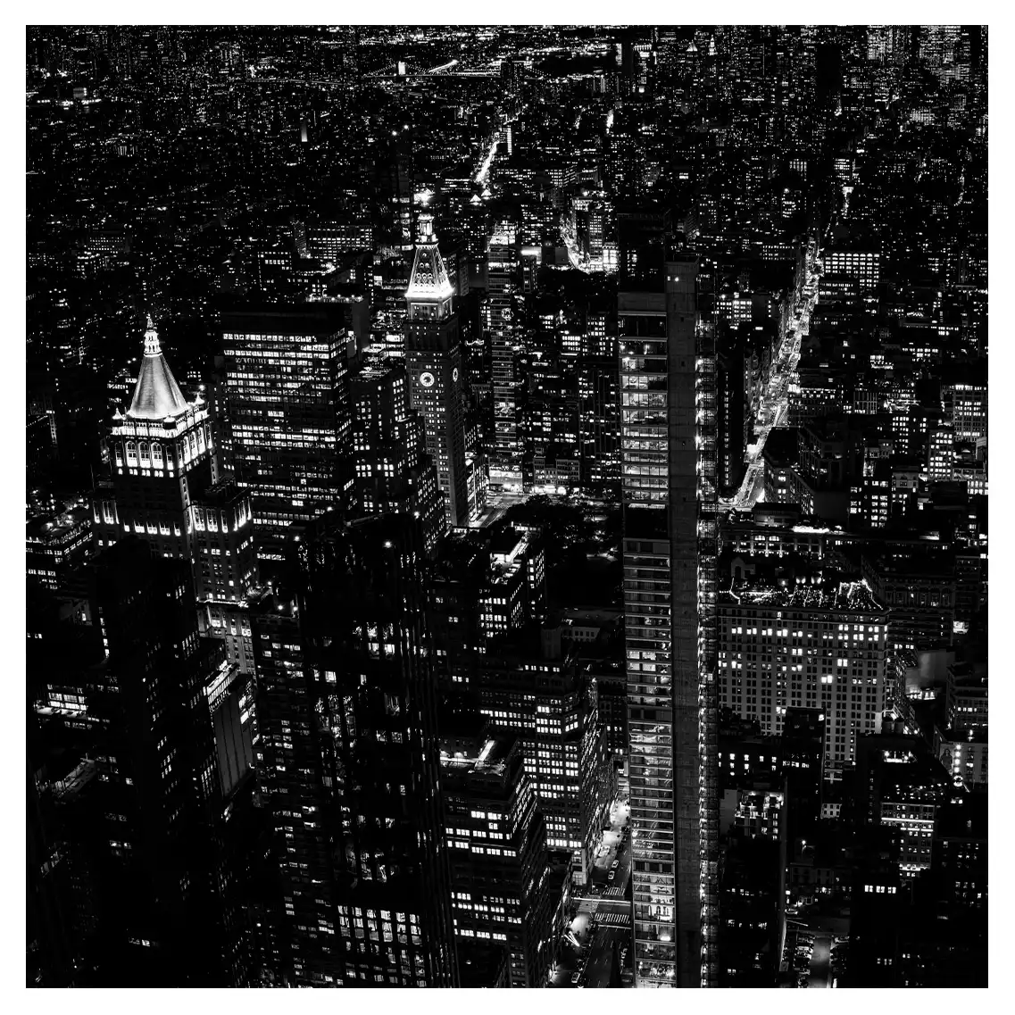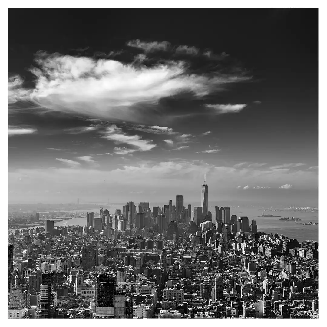 Le format carré impose une stabilité centrale. Il « enferme » la verticalité de Manhattan dans un cadre équilibré, forçant le regard à se concentrer sur le sujet lui-même plutôt que sur sa hauteur infinie.