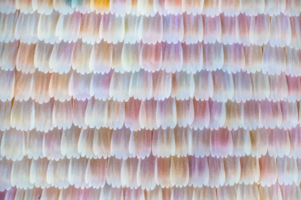 Saviez-vous que la ‘poussière’ qui reste sur nos doigts après avoir effleuré un papillon est composée de ces milliers de petites écailles parfaitement ordonnées ? Ce cliché x20 nous plonge dans l’intimité d’un vol de papillon Cithosia Biblis, révélant la complexité cachée de la nature au microscope x20