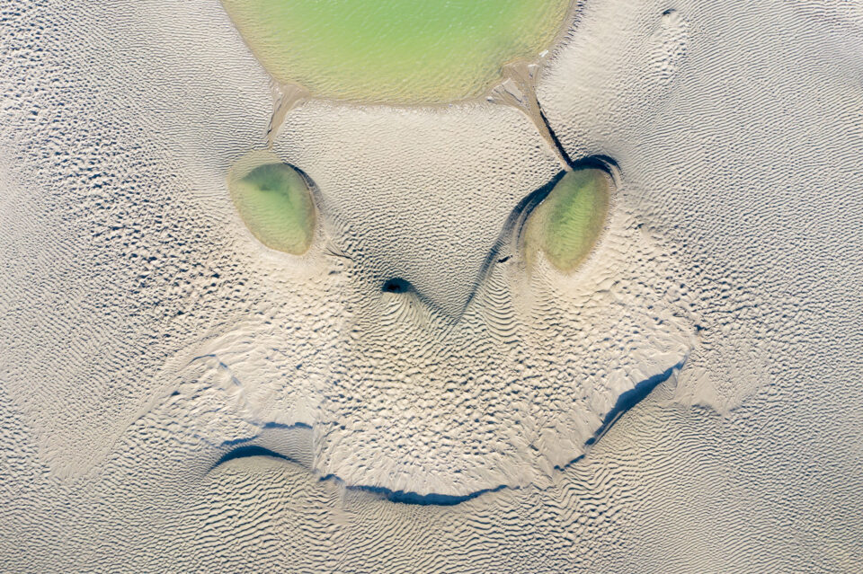 Quand la terre et la mer se rejoignent pour dessiner un visage. Cette photographie aérienne, prise lors d’une grande marée en Baie de Somme, révèle une paréidolie saisissante : le dessin d’une tête de hibou sculpté par l’eau dans les sédiments. Le regard profond formé par les deux bras de mer et le graphisme des plumes suggéré par les méandres créent une présence animale au cœur du paysage liquide. Une œuvre fascinante qui interroge notre perception et célèbre la poésie involontaire de la nature.
