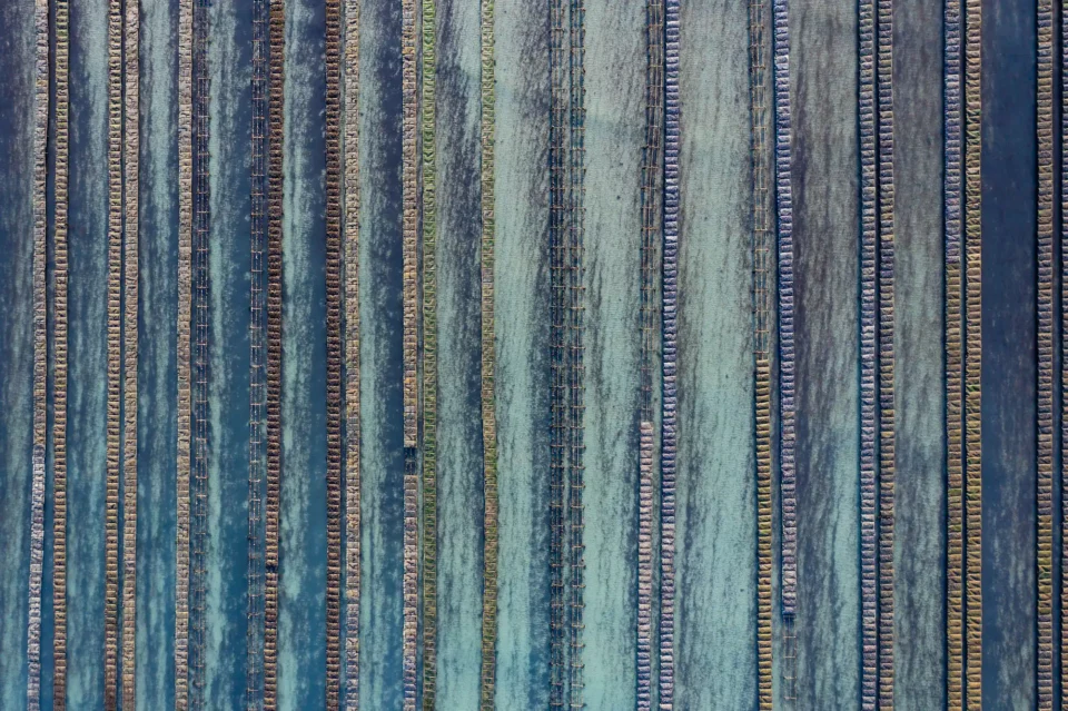 Une vue aérienne des rangées ostréicoles dans la baie de Fresnaye en Bretagne Nord – Côtes-d’Armor