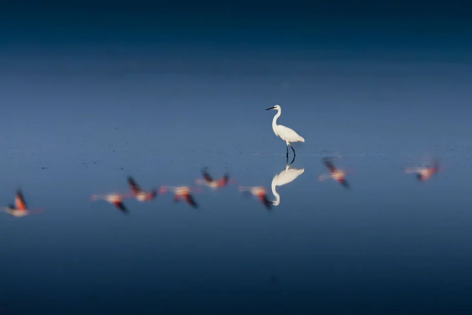 Un instant de grâce pure où deux mondes se rencontrent. Au premier plan, une aigrette blanche d’une sérénité absolue semble ignorer le spectacle qui se joue sous ses pattes : le reflet parfait d’un vol de flamants roses traversant le ciel. Cette composition onirique joue sur la dualité entre l’immobilité de l’oiseau et le mouvement fugace des reflets. Une œuvre d’une agréable finesse, idéale pour apporter une touche de magie et de douceur à votre intérieur.