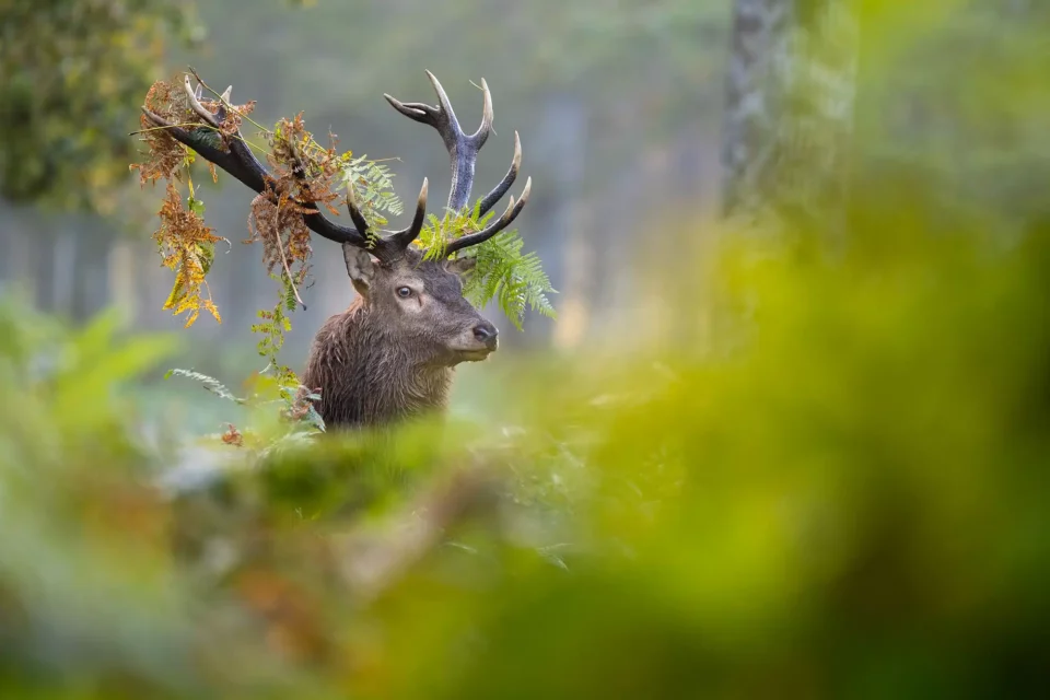 Un Cerf élaphe coiffé de fougères
